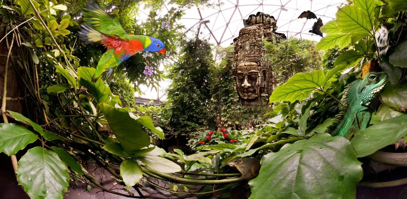 I de tre jungelkuplene vil du se og oppleve et overveldende mangfold av autentiske tropeklima. I disse frodige regnskogene bor det mer enn 250 forskjellige eksotiske og sjeldne dyrearter fra hele verden. Du kan bevege deg til dels fritt mellom 350 ulike tropiske, delvis enorme planter, som for eksempel kjempelianer, trær med høye overflaterøtter samt tordnende vannfall.