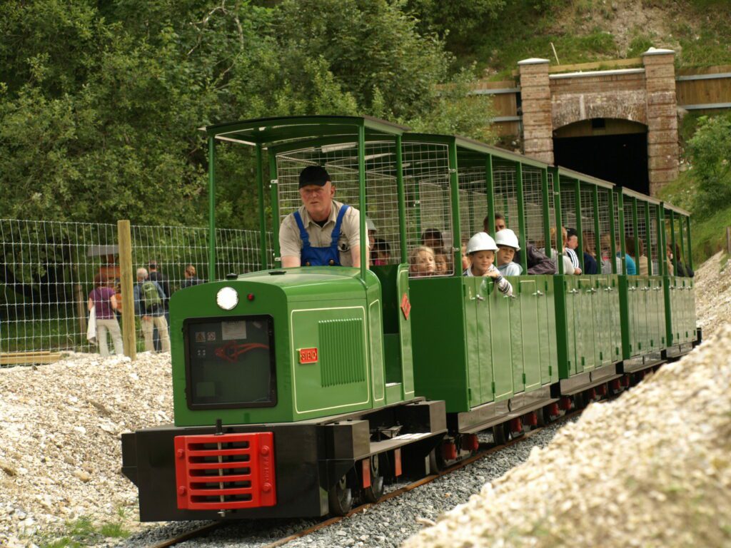Fra midten av mai til midten av august, går gruvetoget fra kalkverket og forbi klipper, steinbrudd og kalksøyler. Du ser underjordiske bekker og innsjøer. I løpet av turen får du et godt inntrykk av tidligere tiders dagbrudd. Gruvetogets endestasjon er den store innsjøen med kinoen.