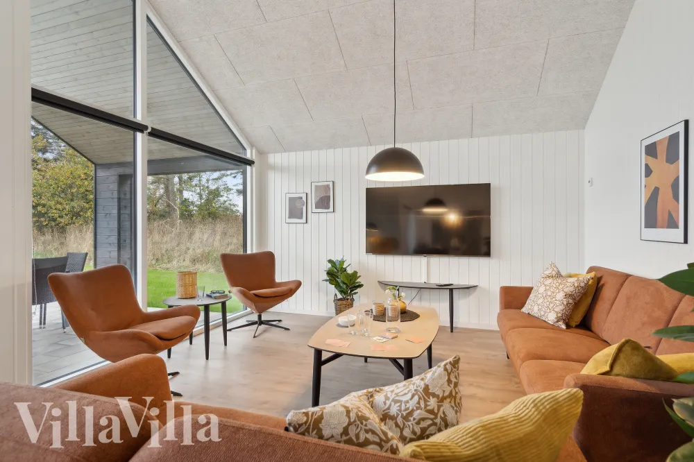 Dette feriehuset er ikke bare en sommerperle, men også det ideelle tilfluktsstedet om høsten og vinteren. Etter en dag med utendørsaktiviteter kan dere trekke dere tilbake til feriehuset og nyte en avslappende stund på terrassen, i badstuen eller i det utendørs boblebadet – eller trekke inn for hygge fremfor vedovnen.