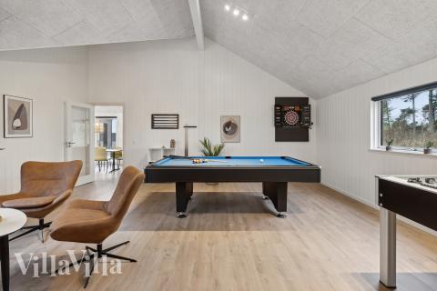 Feriehuset har fem soverom fordelt på to avdelinger, samt to hemser med to soveplasser hver – som er best egnet for barn. Med plass til 14 personer er det rikelig med muligheter for å samles til hyggelige stunder. Med to moderne bad er det god plass til alle – selv på travle morgenstunder. For dere som elsker aktiviteter byr feriehuset på et mangfold av muligheter i det store aktivitetsrommet, som bordtennis, biljard, bordfotball og dart. Hvis dere er mer interessert i vannlek, kan dere hoppe i bassenget for vannmoro for både store og små – her kommer dere ikke til å kjede dere. Kjøkkenet er husets midtpunkt. Her kan dere samles og nyte måltider rundt det lange spisebordet.