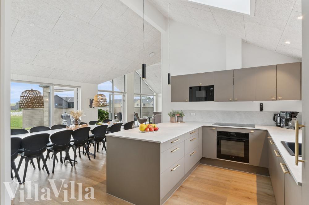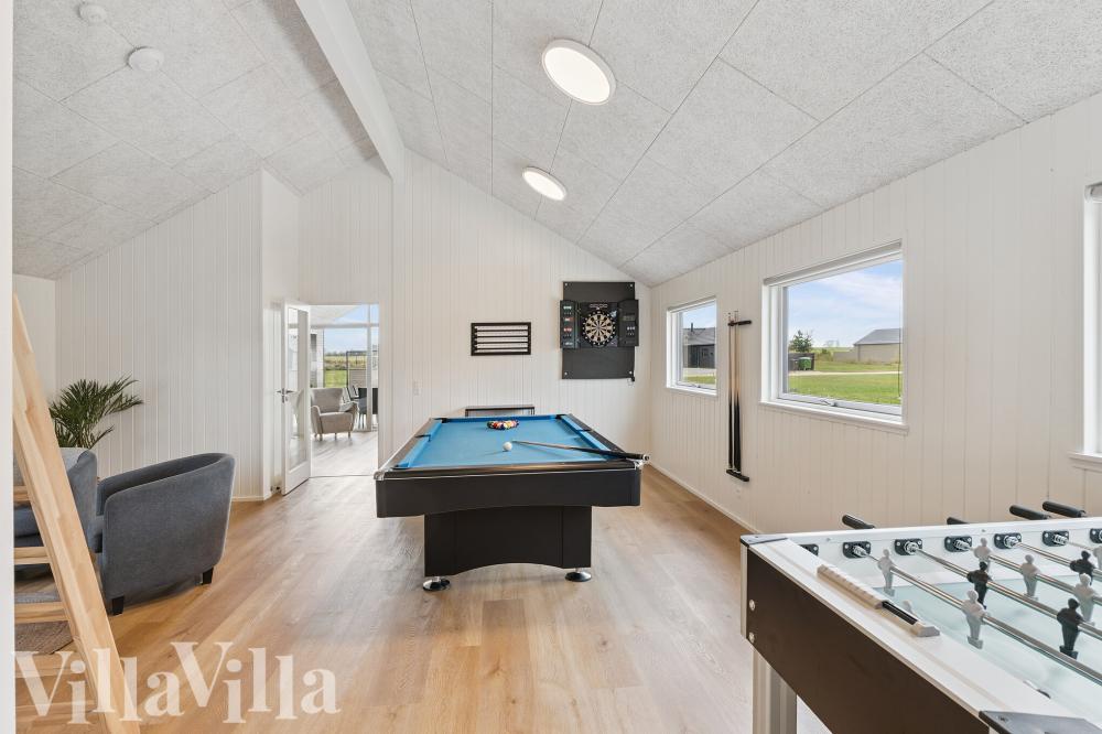 Det romslige feriehuset er innredet med fokus på komfort og samvær. Her finner du et stort, åpent oppholdsrom og 5 separate soverom, hvorav ett har dobbeltseng og køyeseng. For de som elsker morsomme aktiviteter, er huset utstyrt med bordtennis, biljard, bordfotball og dart i aktivitetsrommet, noe som gjør det til en sann fornøyelse for både barn og voksne. I hjertet av huset ligger kjøkkenet, den koselige stuen med vedovn og det store langbordet der dere kan samles til middag eller spillekvelder. Herfra kan du også holde et øye med bassenget og nyte at barna plasker rundt.