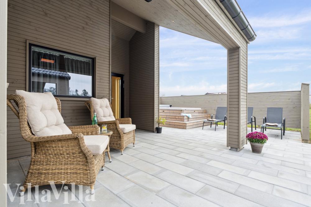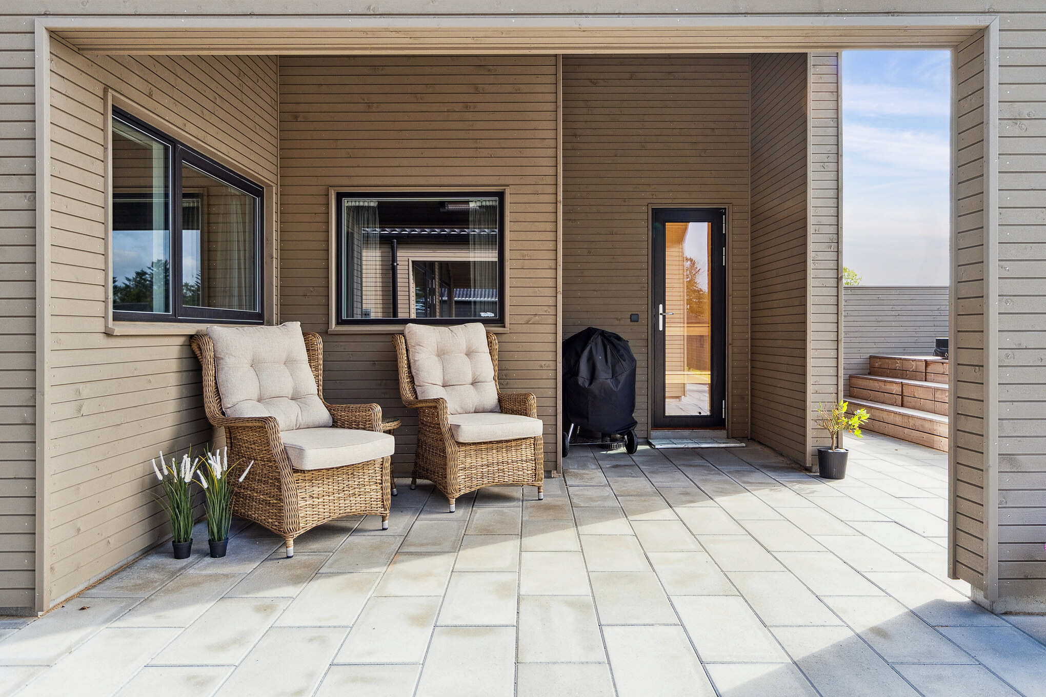 Den store, solfylte terrassen inviterer til avslapning, felles måltider og hygge under åpen himmel. Her kan dere nyte måltidene, ta en lur i solen eller bare være sammen og nyte den avslappende ferieatmosfæren.
