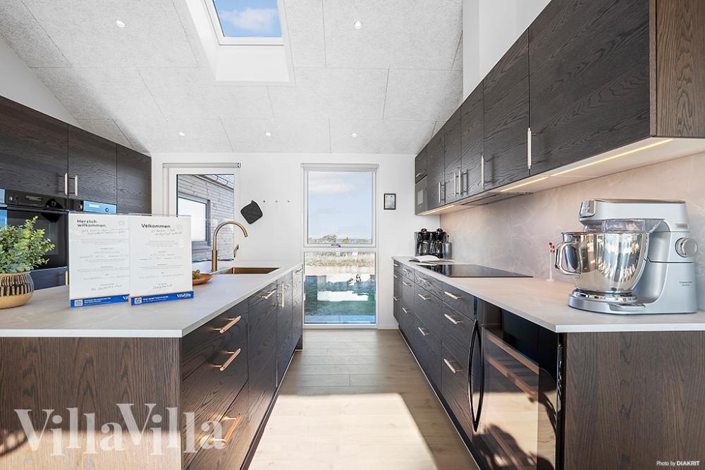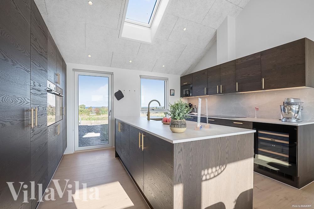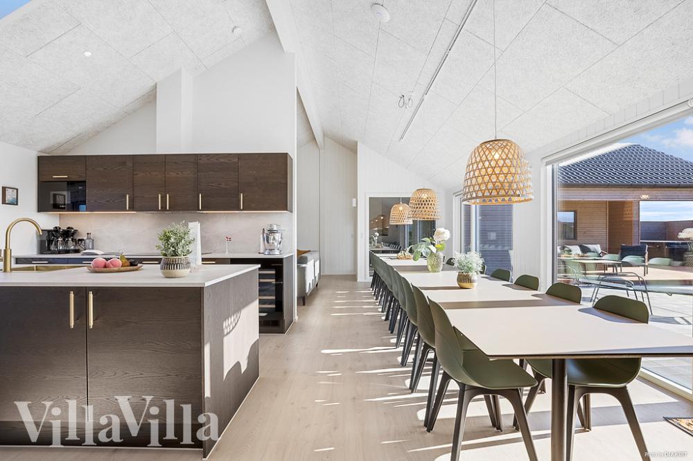 Husets hjerte er det ekstra store kjøkkenet, som er både praktisk og innbydende. Her finner dere to ovner, to oppvaskmaskiner og to kjøleskap, samt en flott vinkjøler, slik at både mat og drikke er lett tilgjengelig. Matlaging blir enkelt, selv for mange, med plass til hele gjengen rundt langbordet. Det store fellesrommet inviterer til prat, latter og god mat i godt selskap.