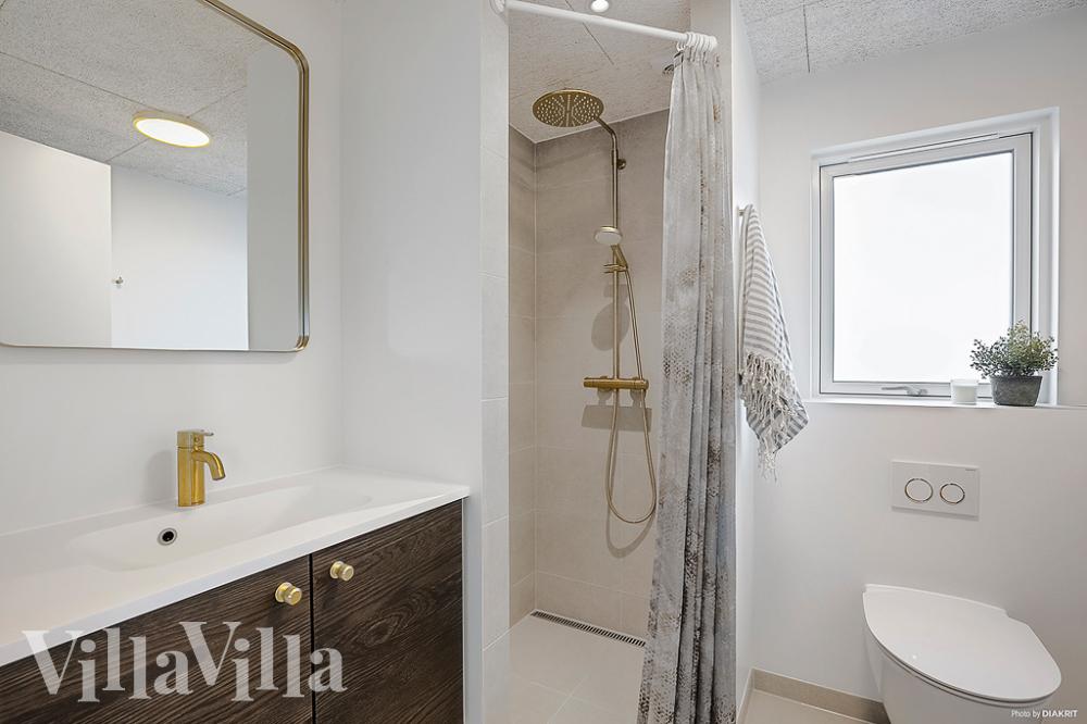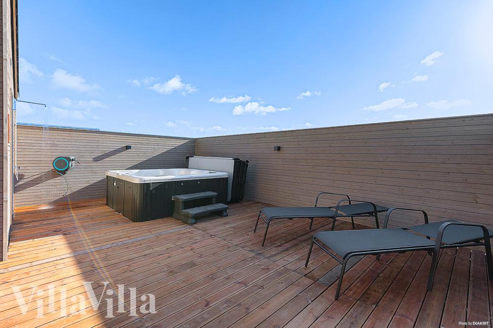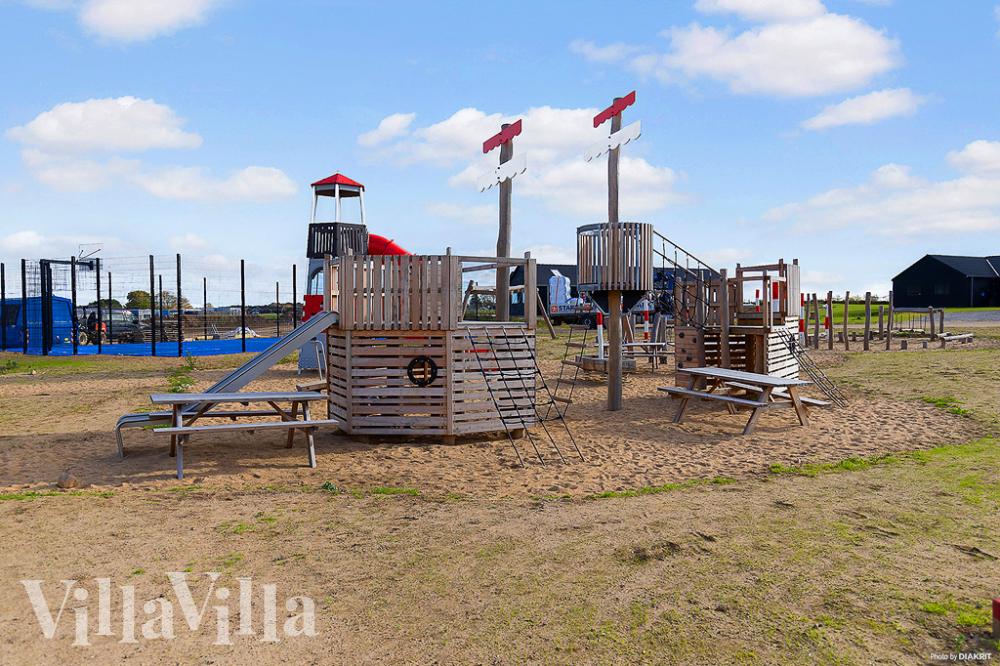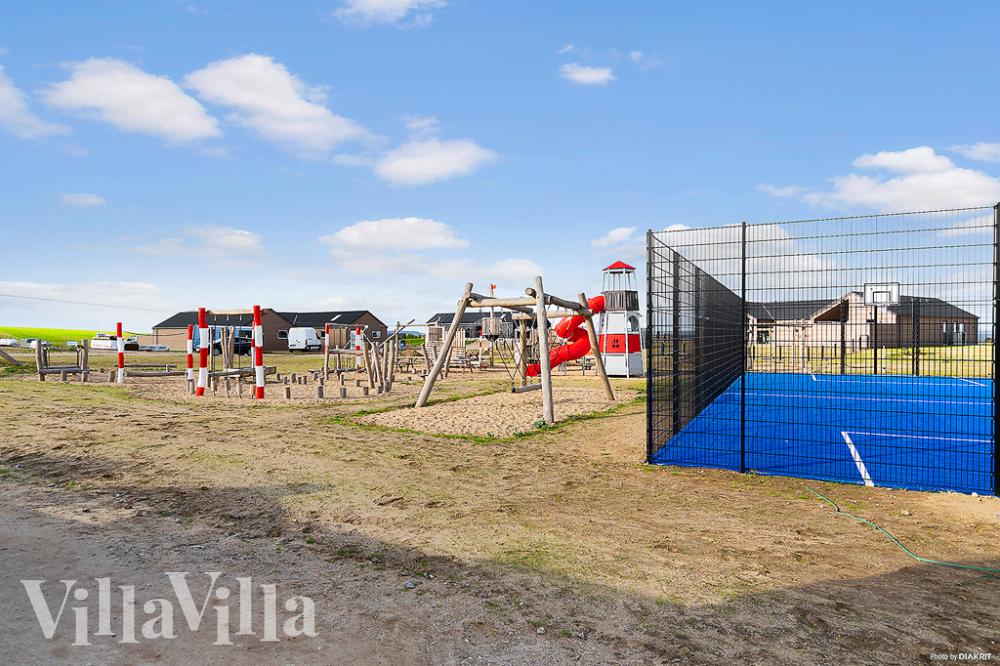 Uteområdet er like innbydende. Den store terrassen har plass til alle rundt langbordet, og her kan dere nyte sommerkveldene med grillmat, god vin og lyden av barn som leker på trampolinen, huskene, i sandkassen eller spiller fotball på de oppsatte målene. Som en forlengelse av hagen har barna enkel tilgang til den store felles lekeplassen, hvor de kan leke i timevis – mens de voksne følger med fra terrassen. Hagen er dessuten inngjerdet, slik at både barn og eventuelle kjæledyr kan bevege seg trygt og fritt rundt. Den overbygde delen av terrassen med loungemøbler skaper den perfekte atmosfæren for avslapning i kveldslyset.