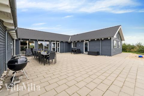 På luksushusets delvis overdekkede terrasse kan dere slappe av og nyte livet under den danske solen. Her er det både grill og hagemøbler til alle gjestene. I hagen er det huske, trampoline og sandkasse til barna.