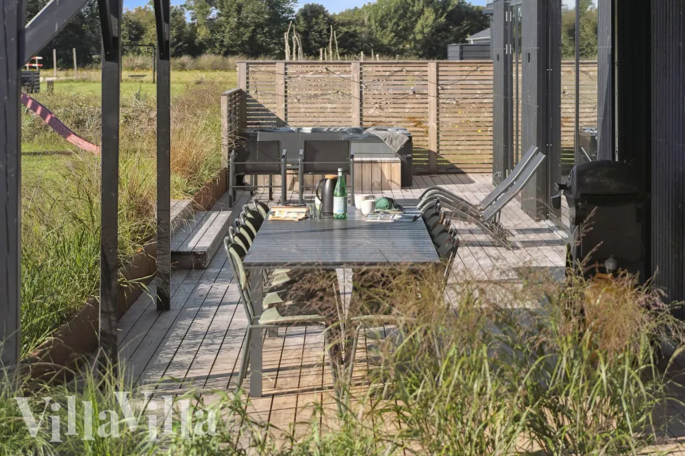 Feriehus med utendørs boblebad, aktivitetsrom og pen treterrasse i Øster Hurup