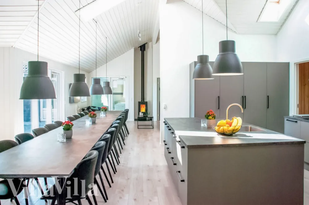Det store, lekre kjøkkenet ble modernisert i 2021. Det er innredet og utstyrt for «feinschmeckere.» Det har også dobbelt opp med hvitevarer. Det er virkelig et kjøkken som inviterer til kos og matlaging. Kjøkkenet ligger i forlengelse av det lyse oppholdsrommet som har en direkte tilknytning til stuen. Midt i huset finner dere det store langbordet hvor alle kan samles for å spille brettspill eller ha det gøy med andre aktiviteter. I den separate stuen ligger det en bar der de voksne kan ha tid til seg selv med TV og behagelige sitteplasser. Stuen befinner seg på den andre enden av aktivitetsrommet.