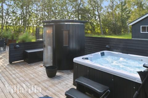 Badeglade gjester kommer garantert ikke til å kjede seg i feriehuset. Feriehuset har en nemlig et stort innendørs svømmebasseng, romersk trapp og motstrømsanlegg. Det er bare å ha på seg badetøyet ute også, da huset har en utendørs badstue og boblebad.