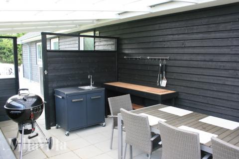 Måltidene kan også nytes på feriehusets delvis overbygde terrasse, der det er mulig å tilberede maten på grillen. På terrassen finnes det dessuten solsenger der dere kan slappe av på solfylte dager. Området er omringet av høy beplantning slik at privatlivet er sikret for hele familien. På vestsiden av huset finner du et nydelig, solfylt uteområde med utekjøkken og et langbord hvor dere kan samles. Barna kan hoppe på trampolinen, huske i hagen, leke i leketårnet eller spille fotball på den store gressplenen i bakgården.