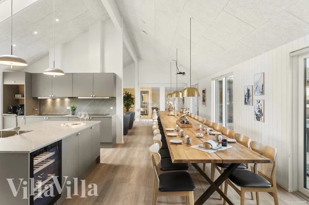 Det ekstra store kjøkkenet er et perfekt samlingspunktet for matglade gjester, med god plass til at flere kan lage mat sammen. Med et vinkjøleskap integrert i kjøkkenet er temperaturen alltid under kontroll, enten dere skal ha bobler eller vin til middagen. Hele rommet smelter sammen med stuen, hvor det lange spisebordet legger opp til samtaler, latter og uforglemmelige middager.