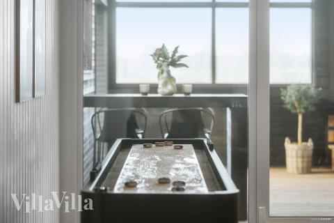 Og når energien bobler over, kan dere ta turen til aktivitetsrommet, hvor shuffleboard, biljard, bordfotball, bordtennis og dart står klart for timevis med morsomme konkurranser. Det er selvfølgelig også en PlayStation 5 for de spilleglade samt en myk sofakrok for dem som bare vil slappe av med en god film. Trenger du å gjøre litt arbeid på farten, eller om bedriften skal samles til en strategiprat, står projektor og lerret klart – og etterpå kan de gode ideene feires i loungen. Utenfor finner dere en overbygd lounge med bar – et unikt sted hvor dere kan skjenke kald drikke og nyte kvelden til rolig loungemusikk og latter, uansett vær.