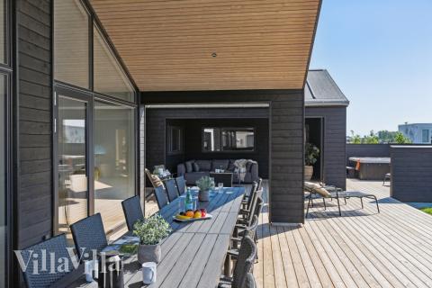 Dette luksuriøse feriehuset fra Skanlux er fullt av aktiviteter, som appellerer til både badeglade gjester og avslappede livsnytere. Uansett årstid kan dere nyte en forfriskende svømmetur i det innendørs oppvarmede bassenget med vannsklie. Forleng utesesongen, selv på kjølige vinterdager, på den koselige treterrassen, i velværeområdet med utendørs spa, utedusj og utendørs badstue. Her kan du virkelig slappe av og nyte velvære under stjernene. På varme sommerkvelder kan du slå deg ned i salongmøblene for å grille, mens barna kan leke i hagen på trampolinen eller huskene.