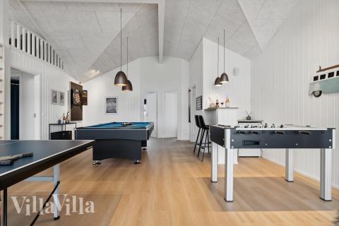 Her finner dere også et stort utvalg av aktiviteter. Innendørs finner dere aktivitetsrommet, spekket med underholdning for alle aldre. Her kan dere konkurrere i biljard, bordtennis, dart og bordfotball. Når det er på tide med en pause fra konkurransene, kan dere nyte en kald forfriskning fra husets bar – bare ta med favorittdrikken deres. I tillegg til det spennende aktivitetsrommet har huset også sin egen bassengavdeling. Her kan både store og små boltre seg og nyte en avslappende dukkert. Både bassengrommet og aktivitetsrommet har direkte utgang til en delvis overbygget terrasse med terrassevarmere. Her kan dere forlenge sommerkveldene med en smakfull grillmiddag, som kan nytes i de komfortable hagemøblene.