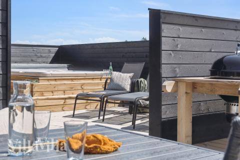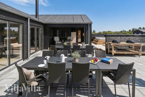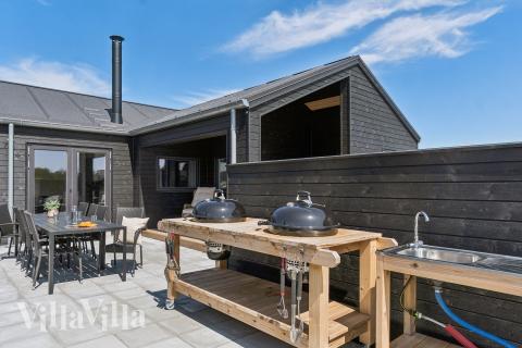 Selv om det danske været ikke spiller på lag, kan feriemåltidene også tilberedes på den flotte terrassen. Her finner du nemlig husets imponerende og overbygde utekjøkken, utstyrt med tre griller. Ved det overbygde utekjøkkenet kan dere nyte måltidene ved det lange spisebordet. Senere kan dere slappe av med en drink i hånden i lekre hagemøbler, med utsyn til de yngste gjestene som boltrer seg på trampolinen.