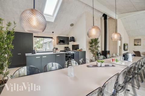 Ved det lange spisebordet er det plass til at alle gjestene kan sitte samlet. Midt i stuen, rett ved sofakroken foran TV-en, er det også en vedovn. Det elegante store kjøkkenet er tilknyttet stuen.