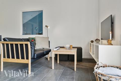I det store kjøkken- og fellesrommet er det plass til at alle gjestene kan samles til et hyggelig måltid. Kjøkkenet er fullt utstyrt for å gjøre matlagingen lett som en plett, og ved det store spisebordet er det god plass til middager og hyggelige samtaler. I tilknytning til allrommet ligger en koselig stue med en komfortabel sofa og en vedovn som skaper en varm og innbydende atmosfære - perfekt for avslappende stunder og koselige kvelder med familien.