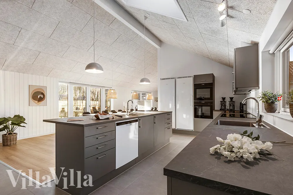 Huset har et imponerende, ekstra stort kjøkken med to kjøleskap, to oppvaskmaskiner og to ovner – alt dere trenger til å tilberede måltider til større grupper. Den åpne løsningen gjør det enkelt å lage mat sammen, og det store spiseområdet har plass til at alle kan nyte måltidene i fellesskap. Deretter kan dere slå dere ned i de myke sofaene og nyte roen mens dere ser film eller spiller et spill.