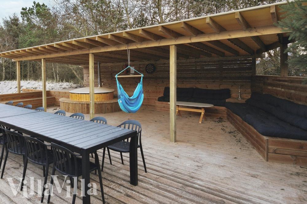 Utendørs finner dere tre herlige terrasser, hvorav noen er delvis overbygde – perfekt for morgenkaffe, soling og koselige grillmiddager. Under et av takene er det en stemningsfull bar med et loungeområde hvor dere kan samles for avslappende stunder. Det står dessuten et innbydende utendørs boblebad klart, som setter prikken over i-en på ferieopplevelsen. Hagen er inngjerdet slik at barna kan leke trygt mens de voksne nyter ferien i fredelige omgivelser.