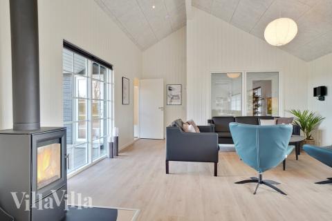 Naturligvis har feriehuset også en vedovn som varmer på kjølige dager! Den finner du i feriehusets oppholdsrom, rett ved både sofakroken og det lange spisebordet med utsikt til terrassen. Det stilfulle kjøkkenet er velutstyrt og har både to oppvaskmaskiner, to stekeovner, to komfyrer, to vasker og god plass i kjøleskapet.