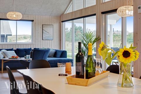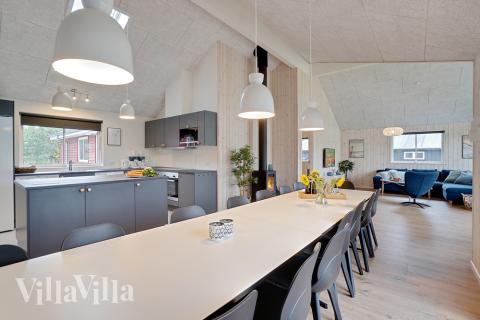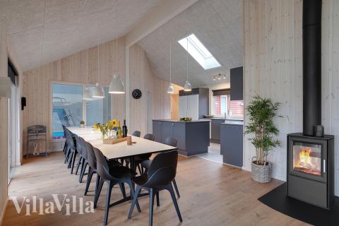 I fellesrommet kan dere nyte varmen fra vedovnen eller slappe av på sofaen med en god film. Fra det lange spisebordet er det god utsikt til bassenget, så det er enkelt å følge med på badeglade barn. Kjøkkenet er stort og godt utstyrt med ekstra oppvaskmaskiner og stekeovner.
