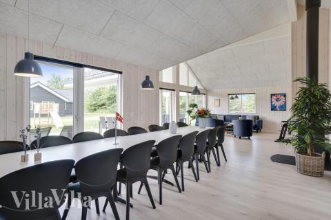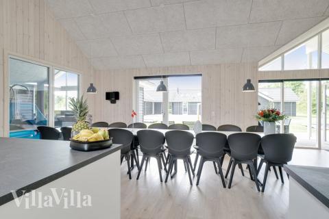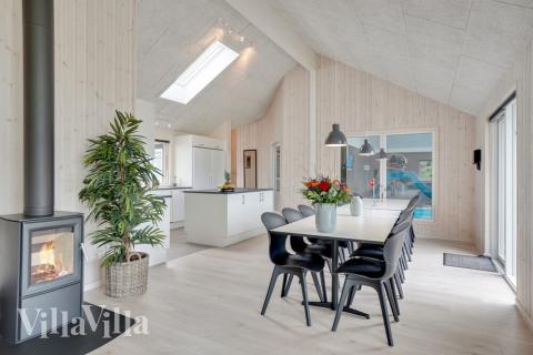 I den store stuen er det lyst og høyt under taket. Veggene i huset er kledd med tre, som gir en koselig atmosfære og følelsen av ekte ferie i Danmark. I oppholdsrommet er det et velutstyrt kjøkken med kjøkkenøy, to oppvaskmaskiner, to komfyrer og kjøleskap/fryseskap. Her er det sofaplass foran fjernsynet, der dere kan kose dere i varmen fra vedovnen.