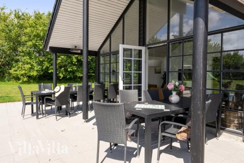 I midten av feriehuset ligger det store kjøkken- og fellesrommet, som består av en hyggelig sofaavdeling med TV og vedovn. Herfra har dere utsikt til terrassen. Rundt det lange spisebordet er det plass til at alle de 18 gjestene kan nyte et herlig måltid, som kan tilberedes i det stilfulle, ekstra store kjøkkenet. Her finnes det nemlig to oppvaskmaskiner, to ovner og god plass i kjøleskap og fryser. Det er en ren fornøyelse å kokkelere her.