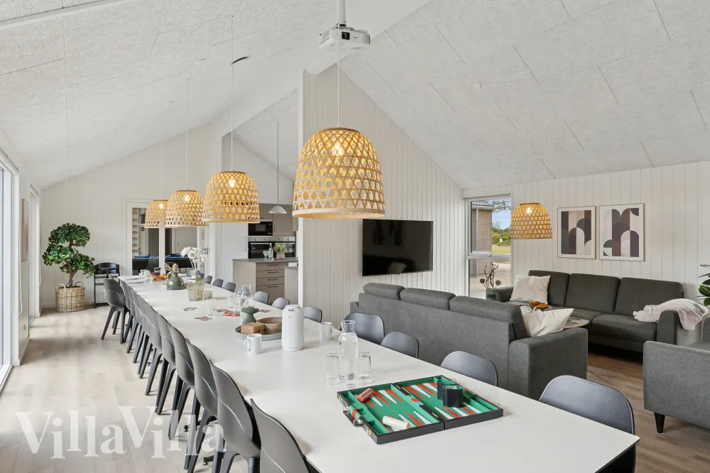Feriehusets store stue gir god plass til felles måltider og avslapning. Det store kjøkkenet er åpent mot spisestuen, slik at matlaging og sosialt samvær går hånd i hånd.