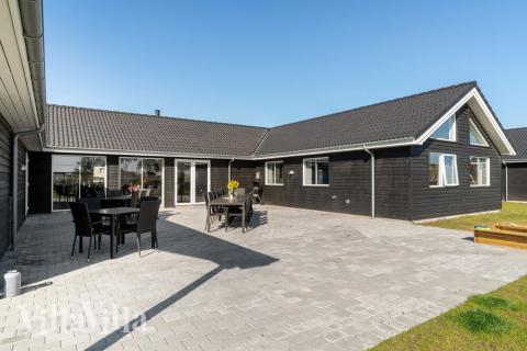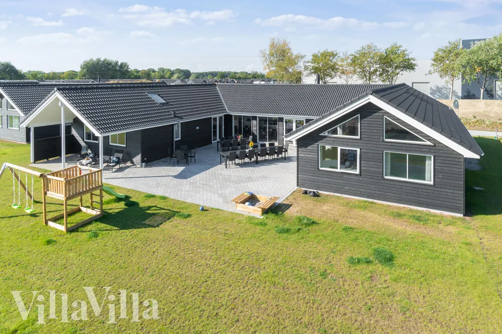 Fra kjøkken- og fellesrommet er det utgang til terrassen med hagemøbler og grill. I nærheten av feriehuset finner dere dessuten en lekeplass til barna.