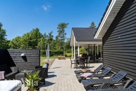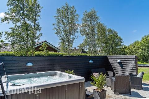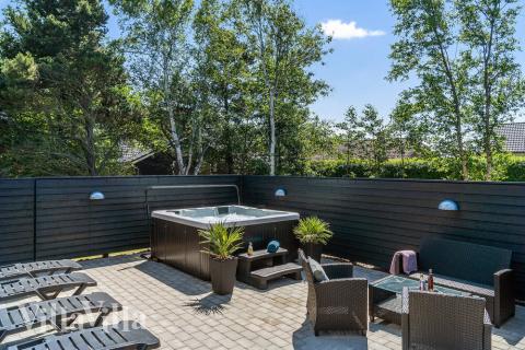 På terrassen finnes det, i tillegg til spiseplass og grill, enda flere muligheter for velvære. I den ene enden av terrassen, kan dere ta en dukkert i feriehusets utendørs boblebad. På varme dager kan dere nyte en forfriskning i den hyggelige sofagruppen, som ligger bak en vindskjerm sammen med boblebadet.