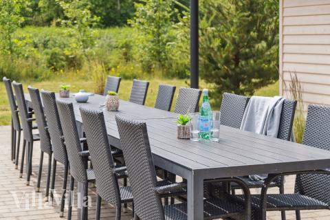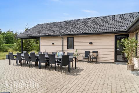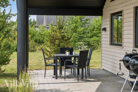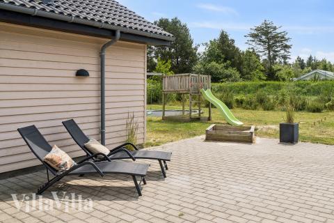 Feriehuset har en flott delvis overbygd terrasse med grill og hagemøbler, som er perfekt for en hyggelig grillkveld eller avslapning i solen. I hagen er det en huske, sandkasse og trampoline til barna.