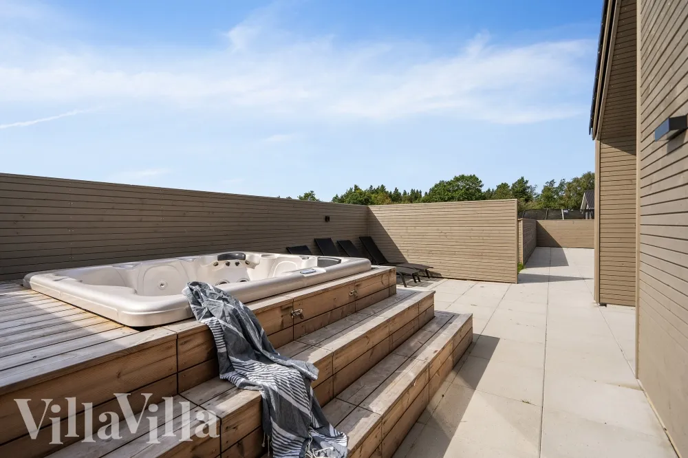 Velutstyrt feriehus med uteboblebad og -badstue.