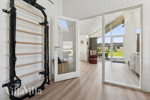 På den sørvestvendte terrassen finner dere en egen liten oase med utendørs boblebad og badstue – perfekt for å nyte solen om dagen og stjernehimmelen om kvelden. Hele gjengen kan samles rundt det lange spisebordet mens deilige måltider tilberedes på det overbygde utekjøkkenet med gassgrill. Rett ved siden av, finner dere den koselige, overbygde utendørsbaren med høye krakker og avslappende atmosfære hvor dere kan nyte kalde drikker, mens barna leker fritt i hagen og bruker energien på det kombinerte klatre- og huskestativet. Hagen er inngjerdet slik at små barn og hunder kan bevege seg fritt. I hagen finner dere dessuten en stemningsfull bålplass med sitteplasser – perfekt for pinnebrød, fortellinger og kveldskos under åpen himmel. Feriehuset har også en ladestasjon slik at elbilen enkelt kan lades under oppholdet.