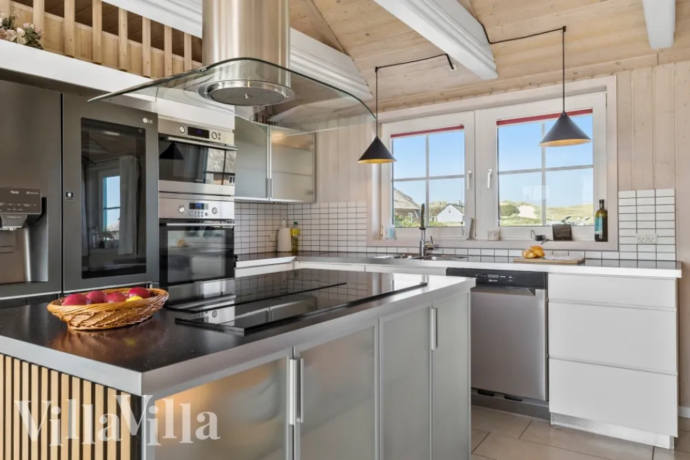 En stor inngjerdet terrasse gir trygghet for både små barn og hunder – her kan de ferdes i trygge omgivelser. Utenfor kan dere bruke en fantastisk lekeplass med blant annet et stort leketårn, husker og en hinderløype. Huset er dessuten utstyrt med energisparende tiltak som forsikrer et lavere energiforbruk. Hvis dere har lyst på en tur på stranden, må dere ikke gå langt – den ligger praktisk talt i bakhagen. Her kan dere ta en flott gåtur langs vannet eller hoppe i bølgene – så lenge været tillater det.
