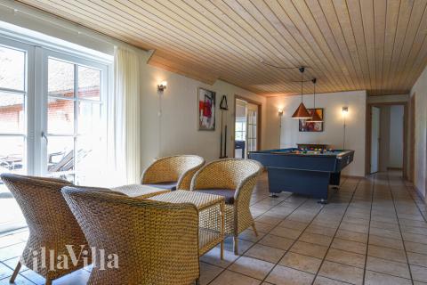 Dette lekre luksusferiehuset er bygget i idyllisk Klitgård-stil, som er typisk for området. Den flotte bassengavdelingen med 25 m2 stort basseng med motstrømsanlegg, vannsklie og et stort innbygget boblebad må oppleves. Kjøkkenet er forbundet med en stor spisestue og oppholdsrom med vedovn, og er komfortabelt innrettet med god plass til 24 personer. I aktivitetsrommet er det et stort utvalg av aktivitetsmuligheter som lufthockey, biljard, bordtennis, Playstation 2 og fotballspill. I stuen er det en hyggelig bar, hvor man kan få... Les mer